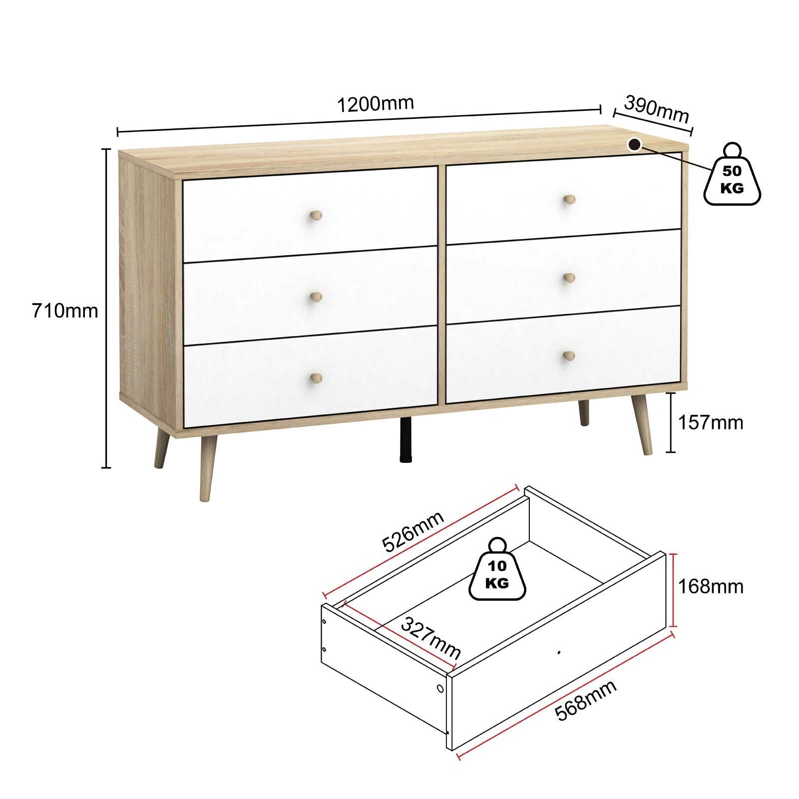 Introducing the Scandinavian - style Adriana 6 Drawers Chest of Drawers dresser - the perfect storage solution for any bedroom. With its sleek and modern design, this lowboy chest of drawers dresser is the ideal way to keep your clothes and other personal items organised. Featuring 6 spacious drawers, this chest of drawers dresser provides ample storage space for all your clothing and accessories. The tapered wooden handles on each of the drawers add a touch of elegance to the overall design, while the realistic oak - effect finish adds depth and texture to the surface of the chest of drawers dresser. Measuring in at a convenient size of length 120cm, width/depth 39cm, and height 71cm, this lowboy chest of drawers dresser is perfect for fitting into any bedroom. Its Scandinavian - style splayed legs provide stability and support while adding a touch of sophistication to the overall design. Its versatile and stylish design, ample storage space, and realistic oak - effect finish make it a standout piece that will enhance the overall look and feel of your bedroom. Matching Adriana 5 Drawer Tallboy and bedside table are available for sale separately.