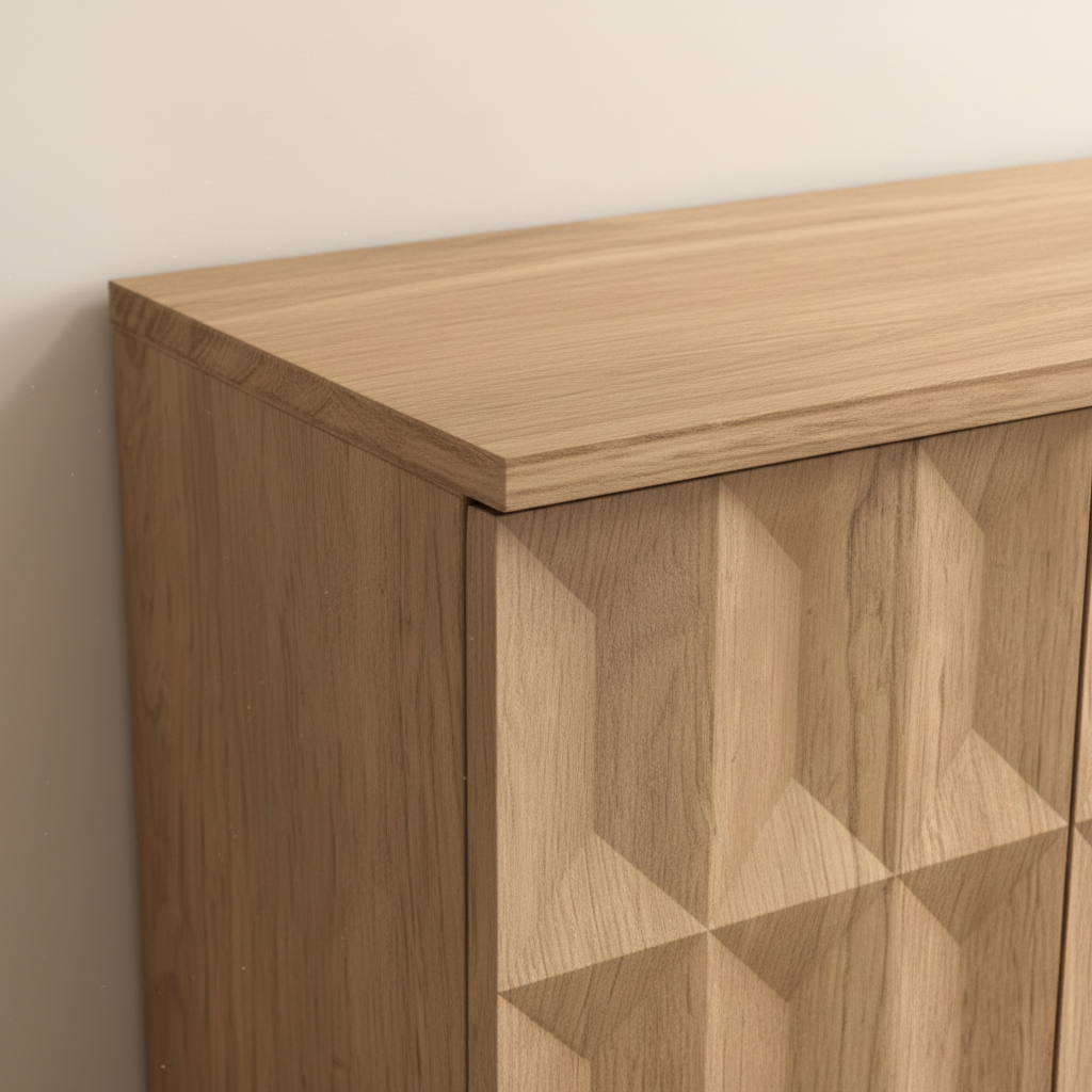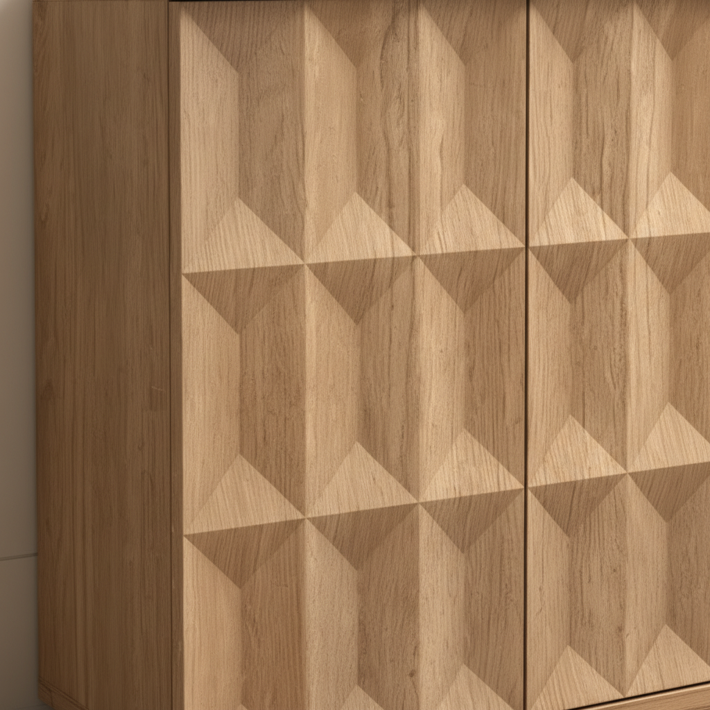 Transform your living or dining space with this stunning buffet sideboard featuring bold 3D geometric pattern detailing on four sleek doors. The warm oak finish paired with subtle wood-grain texture creates an inviting, versatile piece that seamlessly complements contemporary, modern, and minimalist decor styles.