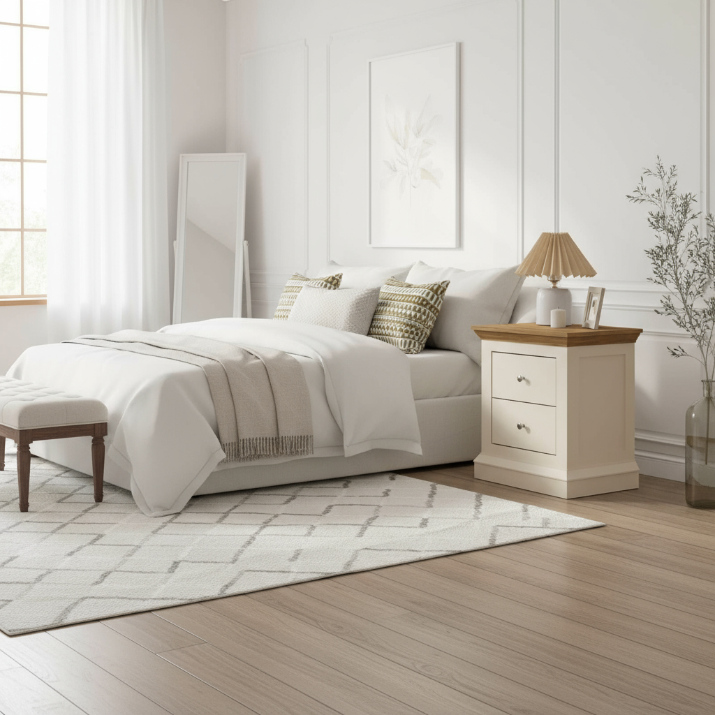 Transform your bedroom with this charming Hannah duo set - a pair of bedside tables that brilliantly marry warmth with contemporary style. Each piece showcases a delightful contrast between creamy bases and rich pine oak-effect tops, complete with beveled edges and textured detailing that whisper countryside charm. Sturdy and substantial, these nightstands aren't just pretty faces. Two silky-smooth drawers glide effortlessly on whisper-quiet metal slides, giving you sneaky storage spots for everything from reading glasses to midnight snacks. Perfect for adding personality and practicality to your sleeping sanctuary, these beauties prove that style and function can absolutely be best friends.