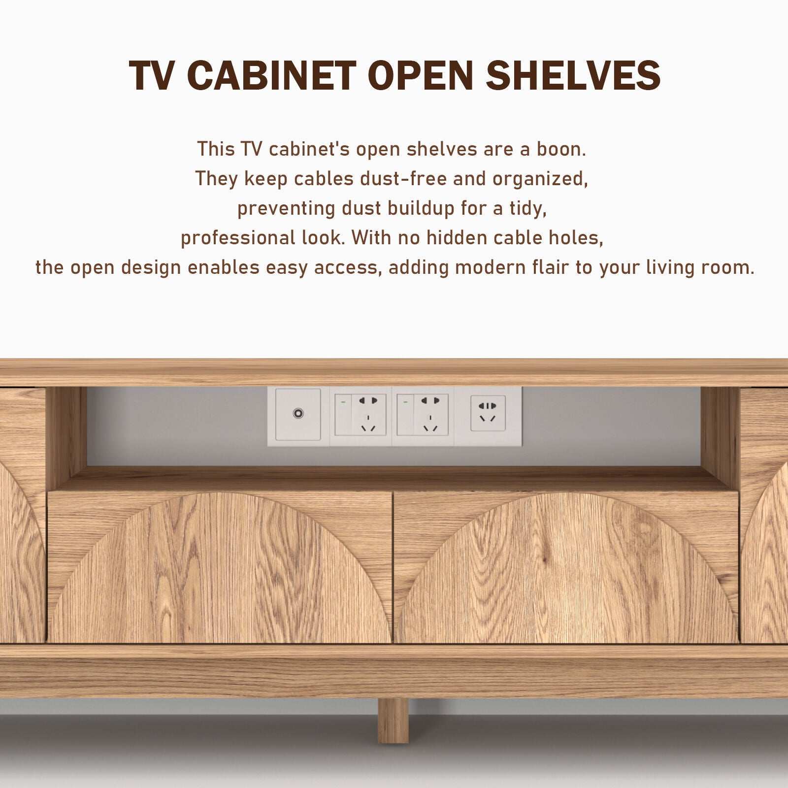 This entertainment unit, specifically the TV unit, features a sleek and minimalistic design. With a width of 180cm, it is perfect for housing your TV, DVD player, and other media equipment, serving as the central hub for your home entertainment system. It is made of MDF and features a sleek finish with natural wood grain accents and an elegant Arched pattern on the cabinet doors. This unique design element of the entertainment unit adds a touch of classic sophistication, blending seamlessly with the modern style.